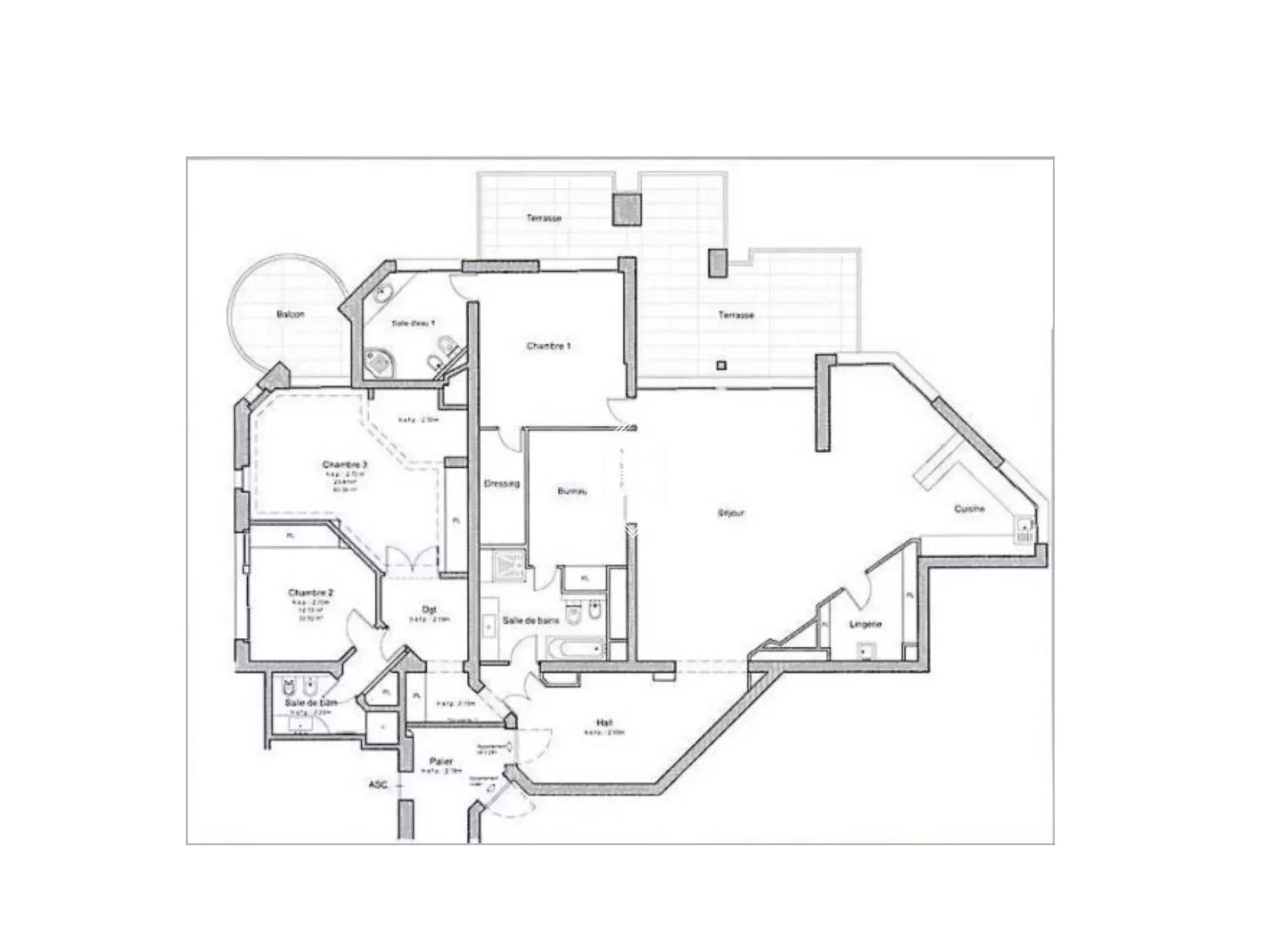 The apartment comprises an elegant entrance hall leading to a very spacious living room, extended by a large modern kitchen open onto the living area. The sleeping area includes two large bedrooms with walk-in closets and built-in storage, two shower rooms, an additional bedroom, one bathroom, as well as a study.